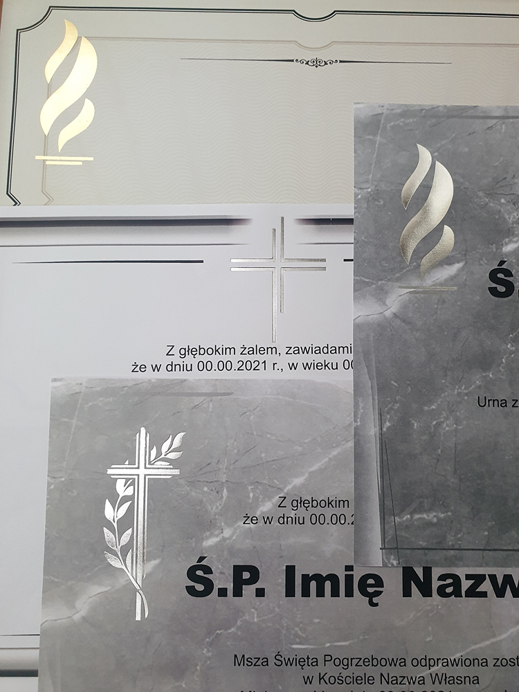 Otrzymują Państwo arkusze z wydrukowaną grafiką i tłoczonym sygnetem krzyża z wolnym polem na wdrukowanie treści klepsydry.